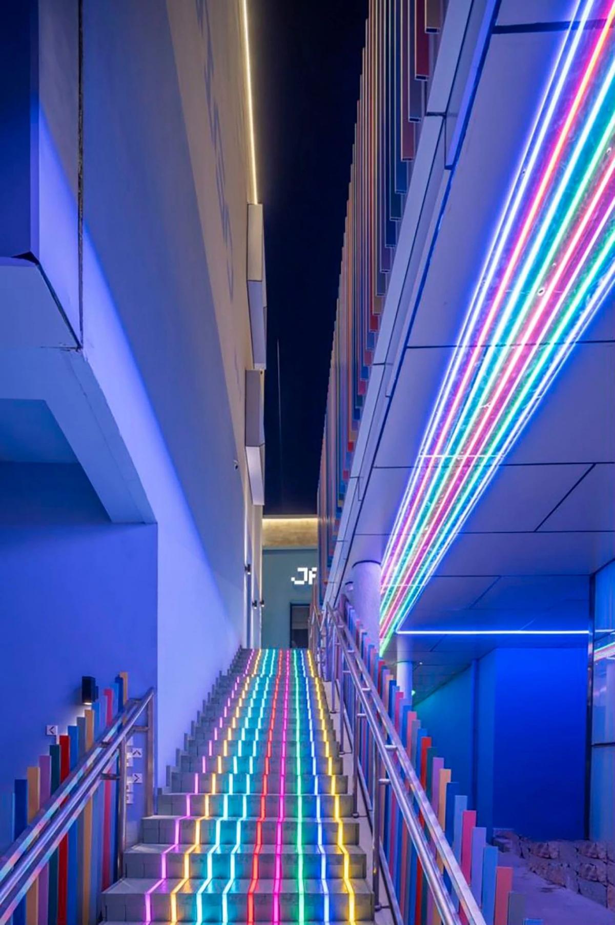 在空中連廊的上層吊頂和地面平臺采用內(nèi)嵌彩色燈帶作為指示系統(tǒng),每一條燈帶的顏色對應(yīng)相同顏色的建筑,每一種顏色的燈帶都指向由同樣顏色命名的酒店入口,通過這種簡潔有趣的引導(dǎo)方式既起到導(dǎo)向標(biāo)識作用同時又可作為功能照明點亮連廊空間。