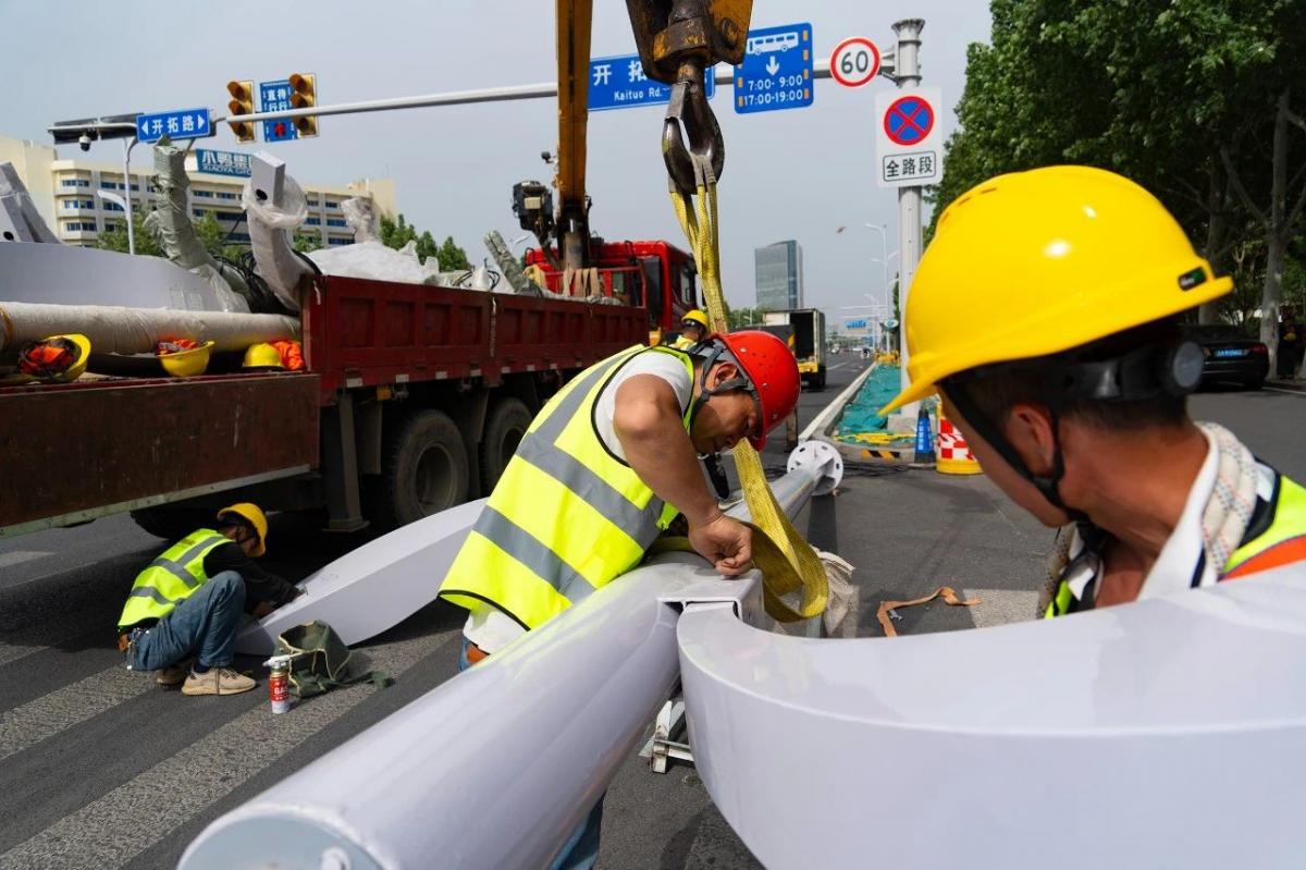 4月30日,記者在工業(yè)南路二環(huán)東路交叉口附近、工業(yè)南路彤霞路交叉口附近看到工人們正在安裝最后6根燈桿、穿線(xiàn)等作業(yè)?!跋韧诼窡艋A(chǔ),然后安裝預(yù)埋件、 安裝燈桿、穿線(xiàn),整個(gè)流程下來(lái)才算初步安裝完成。”