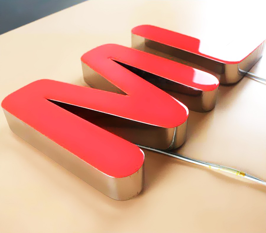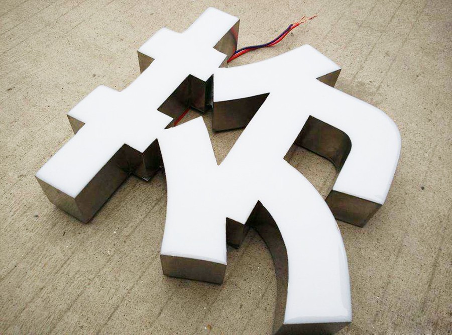 因于樹脂字制作成本高,且室外樹脂字的工藝缺陷,使其戶外使用容易發(fā)黃、變色。為了解決這一難題,于是延伸出了不銹鋼無邊字產(chǎn)品。無邊字繼承了樹脂字的有點(diǎn),無論晚上還是白天一樣的顯示效果,而且相對(duì)樹脂字不褪色、易維護(hù)、成本低,更適合戶外使用。
