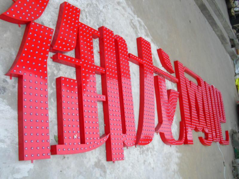 外露發(fā)光字,又稱沖孔發(fā)光字、穿孔發(fā)光字、燈珠字、外露led發(fā)光字、全彩led發(fā)光字等。是指在不銹鋼字、鋁字、鐵皮字等表面上沖孔裝上LED防水燈串。燈串顏色分為單色燈、七彩燈和全彩燈。常用于樓頂大字、門頭招牌。